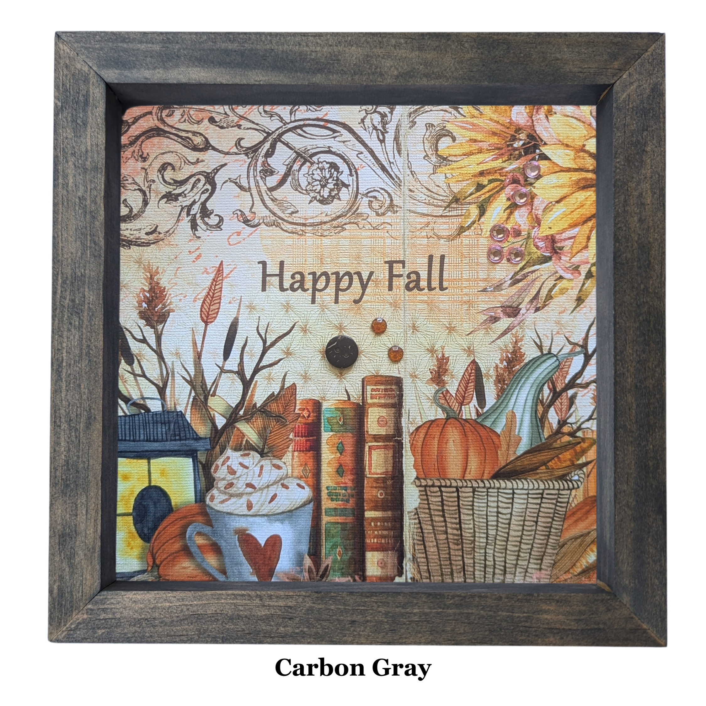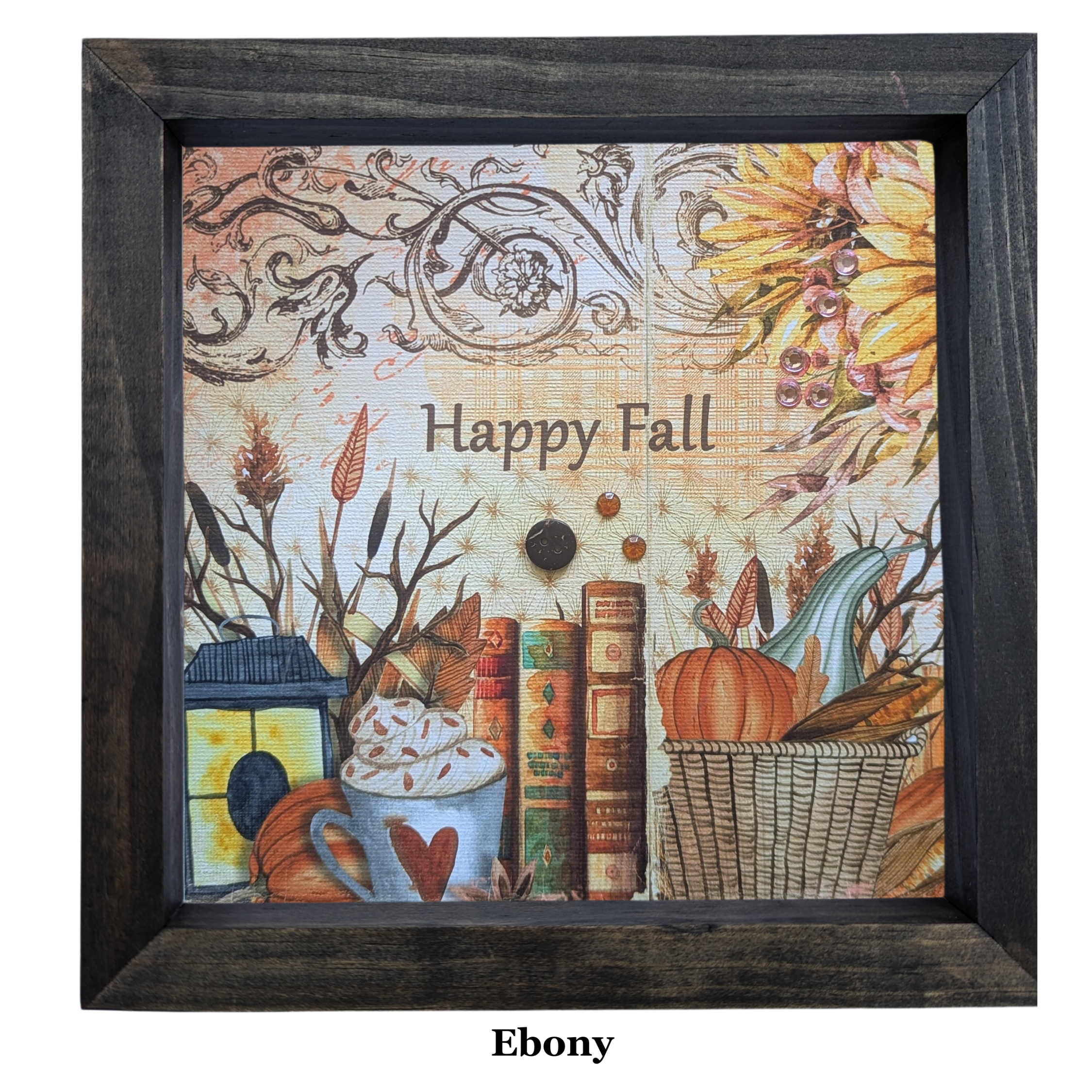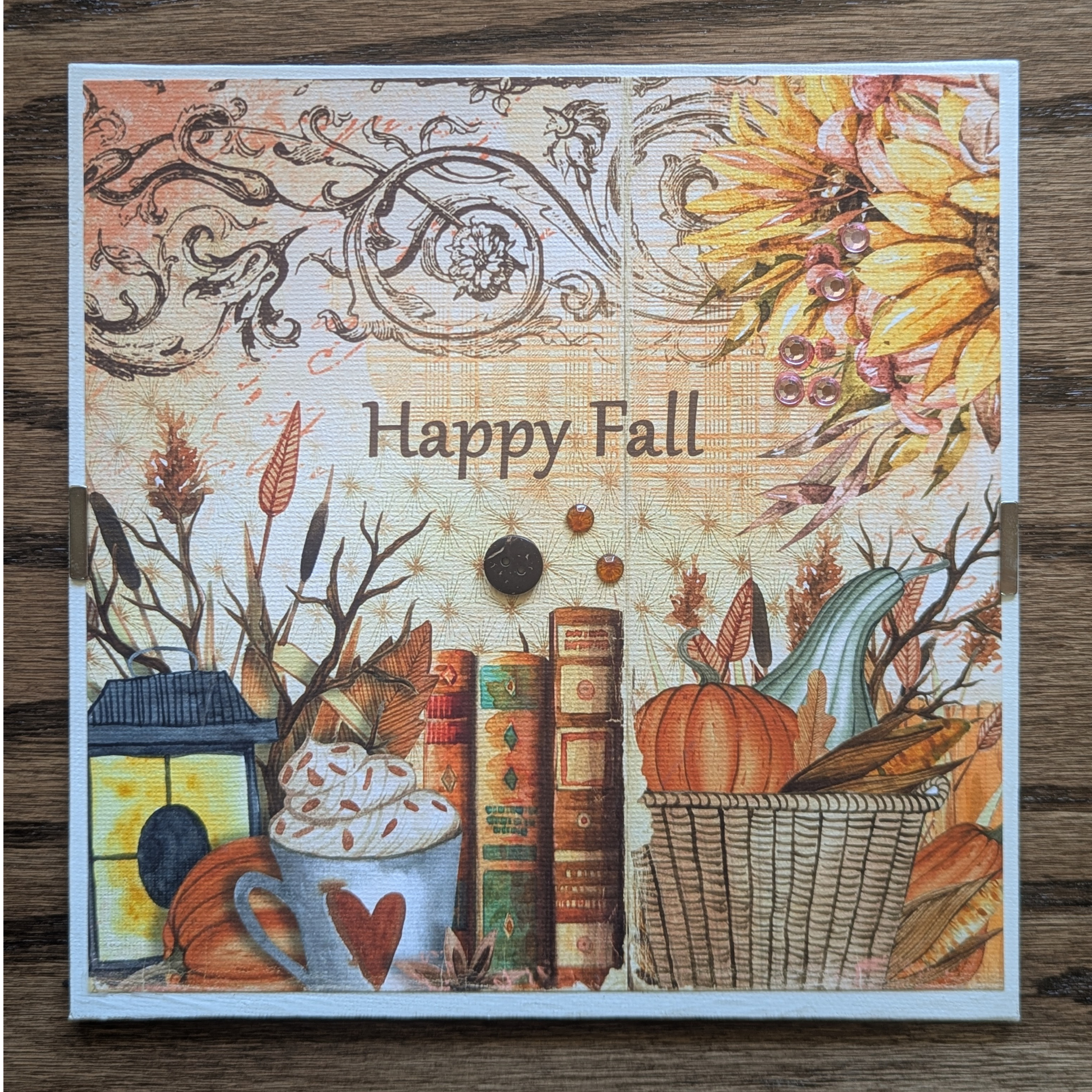 Celebrate the change of seasons with this warm and cozy fall scene. A hot cup of something delicious, a good book, cheery sunflowers and a basket of fall gourds fresh from the garden. Enjoy!