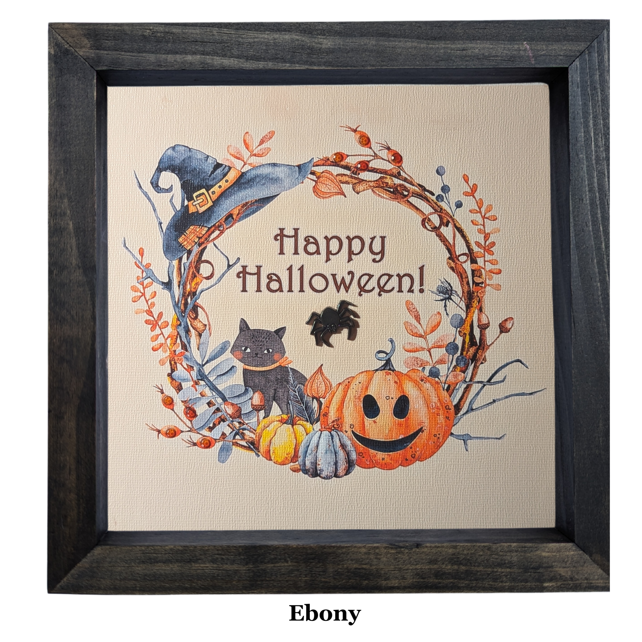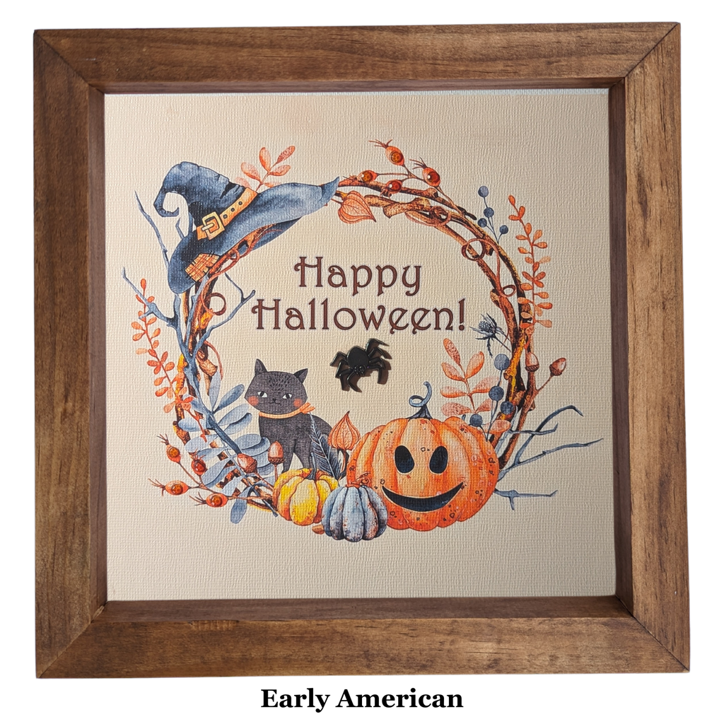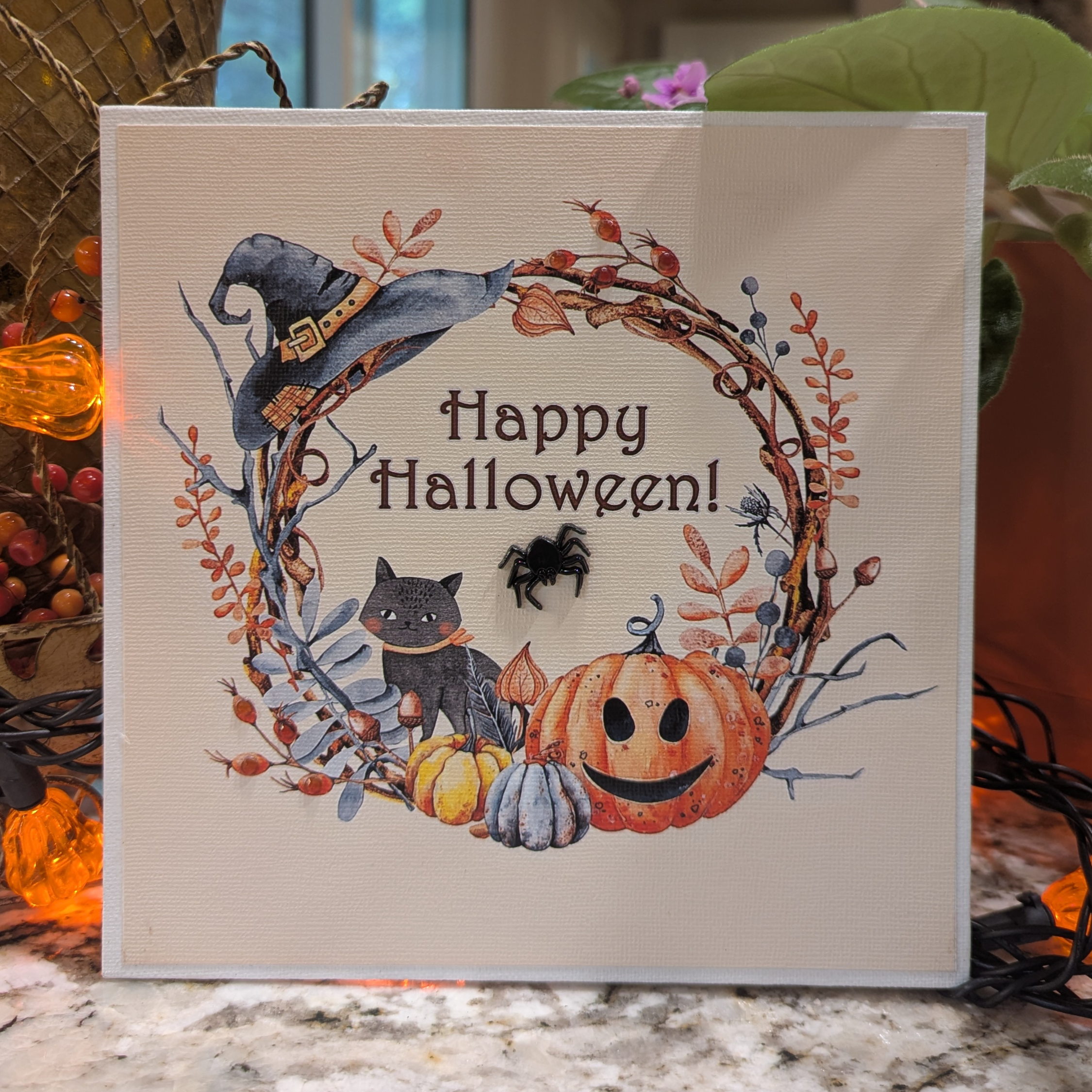 Happy Halloween! This vintage canvas features a well worn witch's hat, a smiling pumpkin and a little black cat, for a not-too-scary celebration of the season.