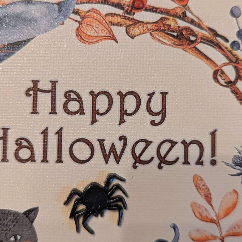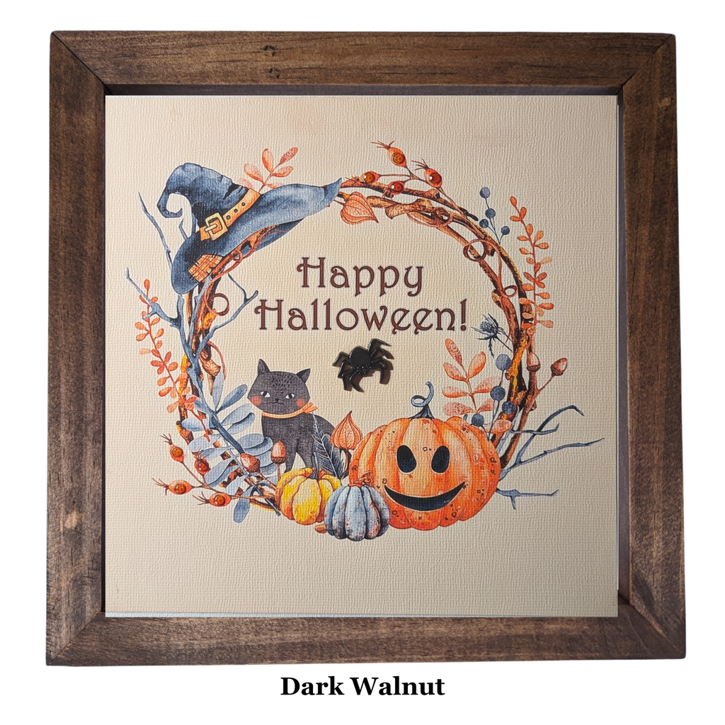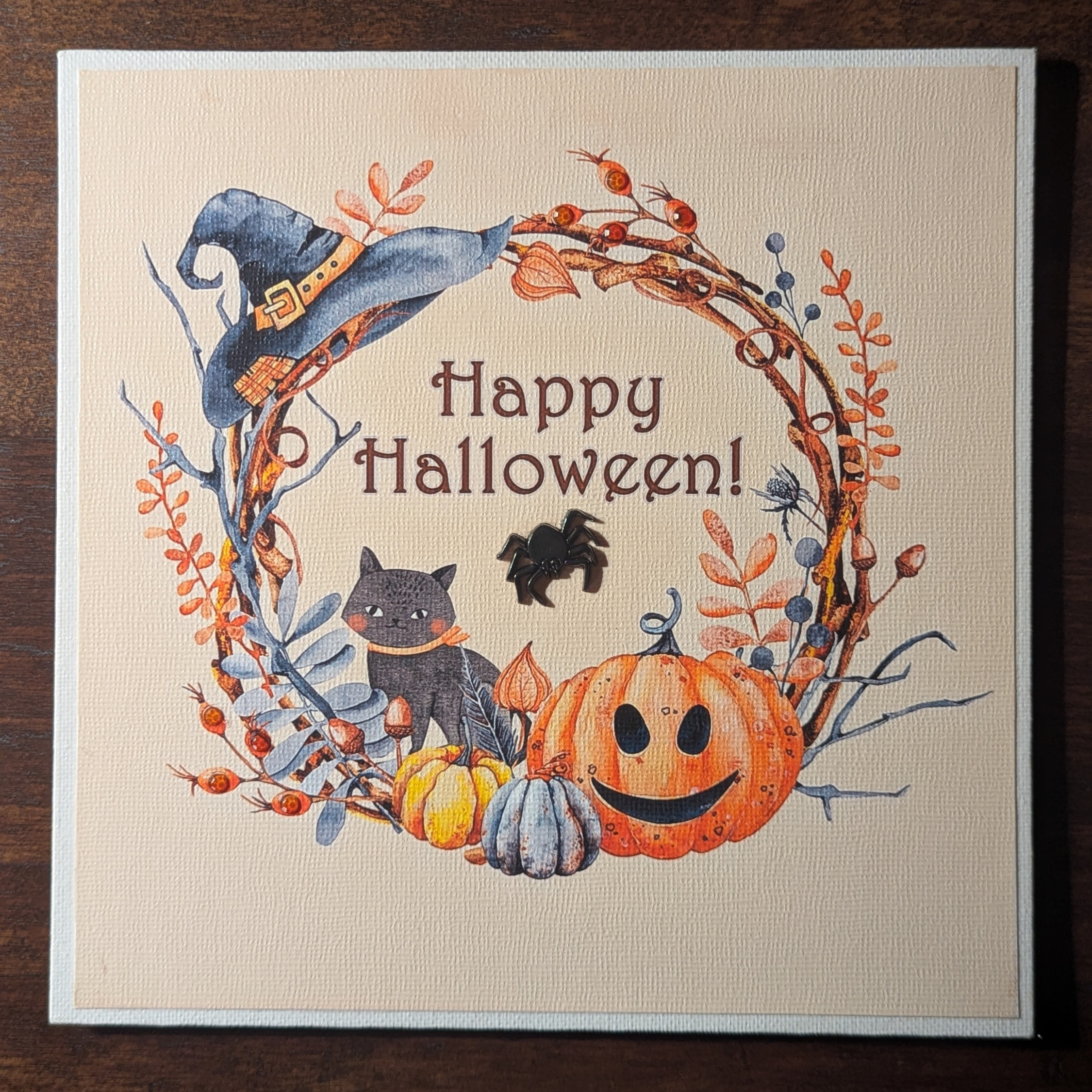Happy Halloween! This vintage canvas features a well worn witch's hat, a smiling pumpkin and a little black cat, for a not-too-scary celebration of the season.